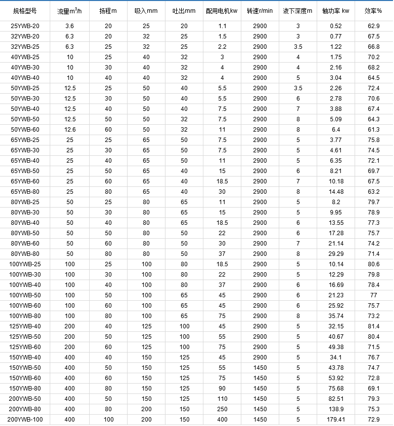 YWB液下無軸泵,適用于在-85℃~350℃條件下,長期輸送任意介質(zhì)酸、氧化劑及腐蝕性介質(zhì),廣泛應用于化工、石油、制 藥、農(nóng)藥、電子、電力、電鍍、冶金、消防、環(huán)保、國防軍工、稀土冶煉等行業(yè)。其液下深度最深可達8米,使用時間是一般長軸液下泵的數(shù)十倍,使用安裝十分方便,克服了原單級單吸液下泵在運輸安裝運行過程中泵軸易彎曲變形(泵軸長度等于液下深度),軸承易損壞、軸套難以維修等缺點。