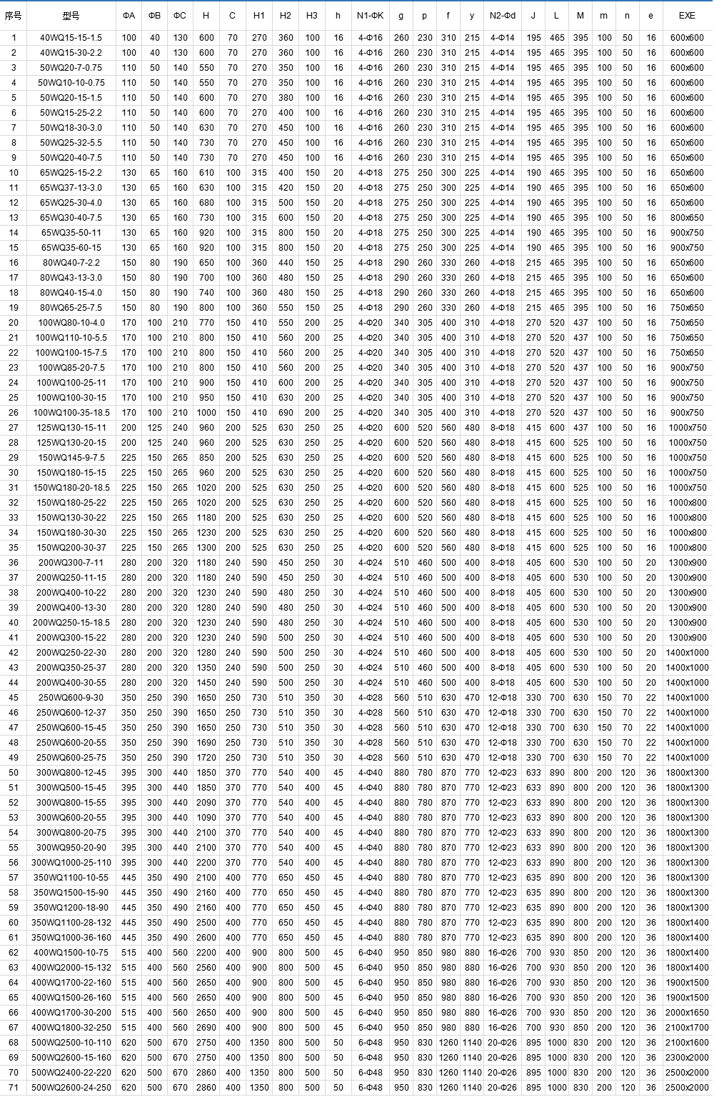 WQ型污水污物潛水泵是目前國內(nèi)較先進與理想的排水機具。該泵采用旋流式的下吸結(jié)構(gòu),具有不怕堵塞,耐磨損、運行可靠、維修方便、排水徹底,適用范圍廣泛等突出優(yōu)點,較好解決了PN濃漿泵不能抽吸重量較大的顆粒以及PW、PWA污水泵易堵塞的難題。