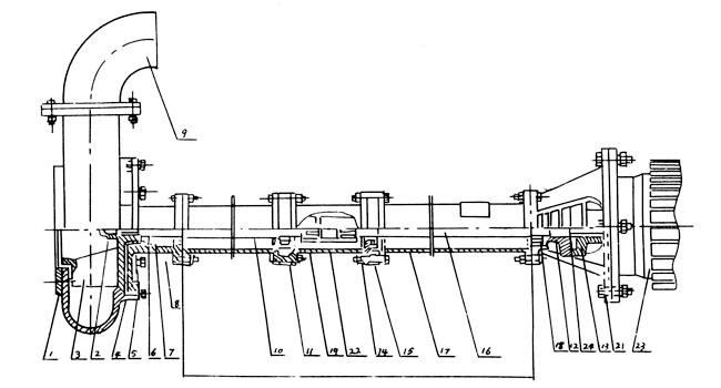 本泵系單級單吸立式離心泵,流體沿泵軸的軸線成70°方向流出,主要部件有蝸殼、葉輪、泵座、泵殼、支撐筒、電機座、電動機等。蝸殼、泵座、電機座、葉輪螺母是生鐵鑄造,耐磨性、耐腐蝕性較好,加工工藝方便。