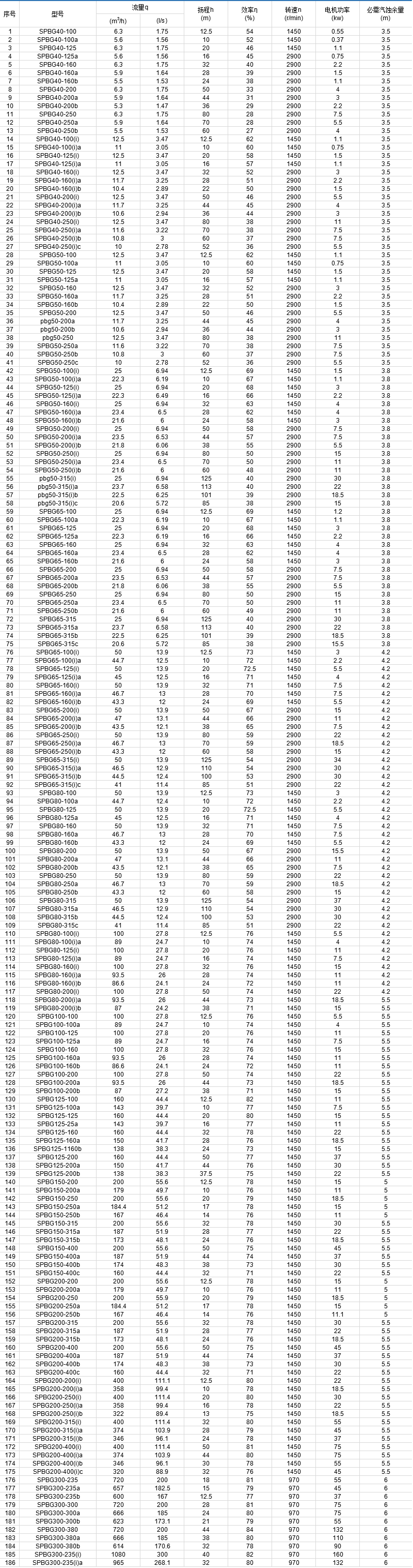 全系列共67個(gè)品種,184個(gè)規(guī)格,其性能范圍:流量6.3~1080m3/h,揚(yáng)程12.5~125m,配用電機(jī)功率0.37~160kw,轉(zhuǎn)速1450r/min和2900r/min。